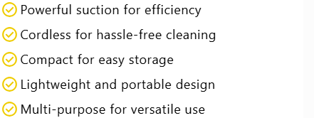 “Keep your home, car, and workspace spotless with this sleek and powerful vacuum cleaner. Designed for convenience and efficiency, it combines strong suction with portability to make cleaning effortless.”